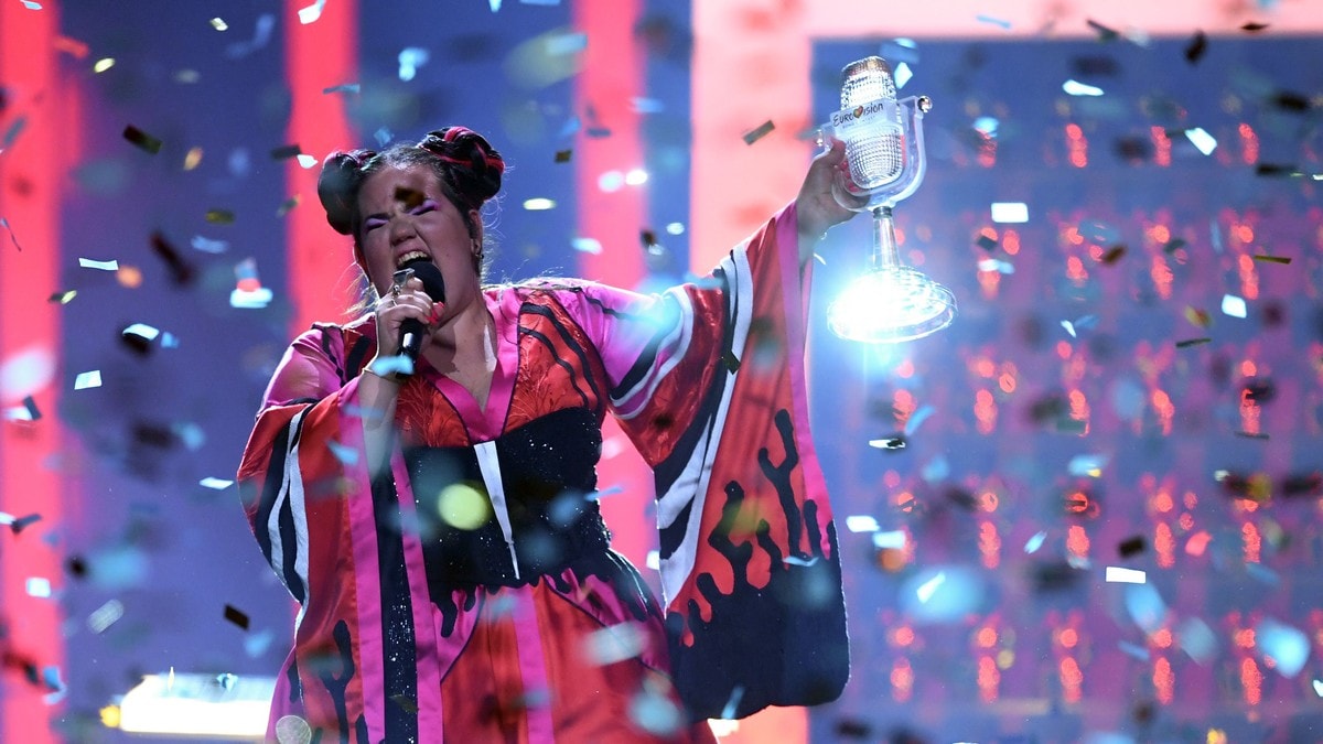 Millions watched on tv and online as israel's netta received the iconic glass microphone from last year's winner salvador sobral.